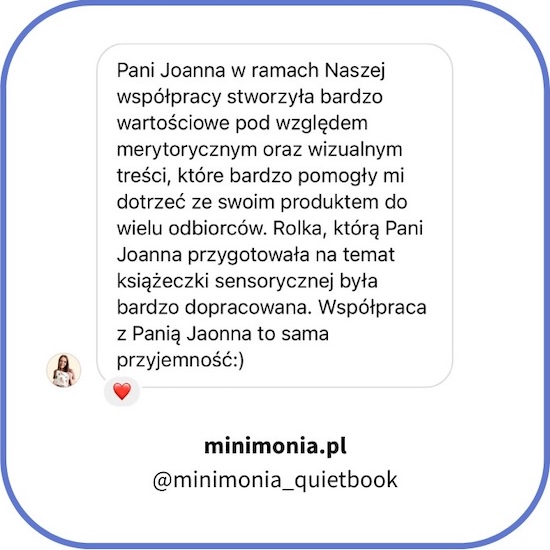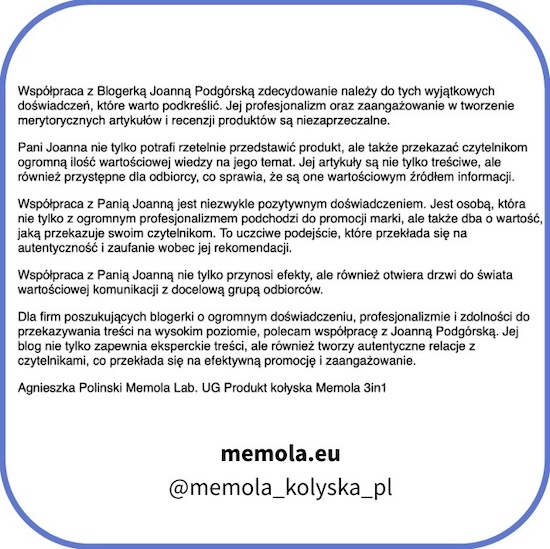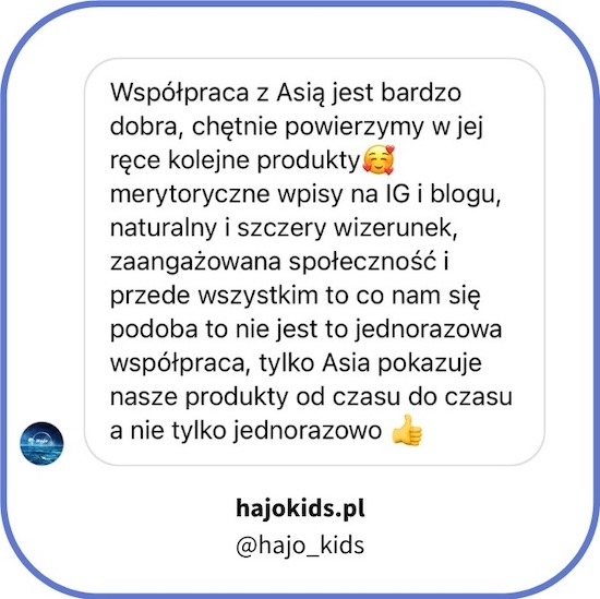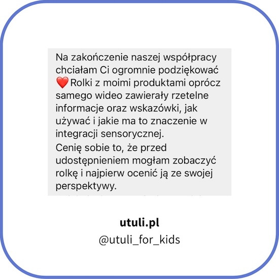 Rzetelna, autentyczna opinia oparta na codziennym użytkowaniu – pokazuję produkt w praktyce, z perspektywy mamy i terapeutki. Takie treści budują zaufanie i pomagają rodzicom podjąć decyzję zakupową.