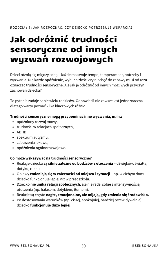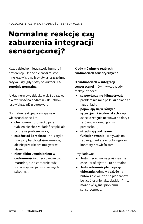 Ebook powstał z myślą o rodzicach i nauczycielach, którzy potrzebują jasnych wskazówek: jak odróżnić to, co mieści się w normie rozwojowej, od zachowań sugerujących potrzebę wsparcia, jak przebiega diagnoza SI i jak mądrze towarzyszyć dziecku na co dzień – w domu i w placówce.
