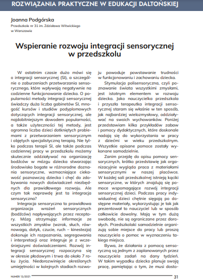 Jakiś czas temu w Inspiracjach Daltońskich ukazał się artykuł mojego autorstwa pt. „Wspieranie rozwoju integracji sensorycznej w przedszkolu”. Dziś na blogu ma swoją premierę wpis, w którym łączę pedagogikę daltońską oraz integrację sensoryczną. Mam nadzieję, że dla nauczycieli przedszkola okaże się inspirujący.
